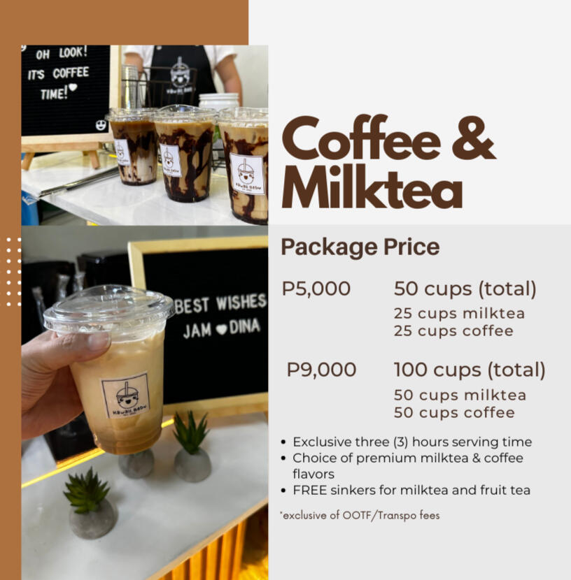 Our irresistible and refreshing iced coffee, using the finest 100% Arabica Coffee Beans. Our mobile coffee cart, we offer selection of six delectable flavors, Kafe Americano, Kafe Latte, Kafe Mocha, Kafe Kastila, French Vanilla, and Karamello.Premium Milktea flavors available from our best seller Wintermelon, Dark Chocolate and Matcha.Make your wedding or birthday bash next-level with our flavorful iced coffee and milkteas. We're all about those good vibes, offering trendy flavors and Insta-worthy sips that'll keep the memories buzzin' long after the last drop. Surprise your guests with overflowing coffee at your event.
